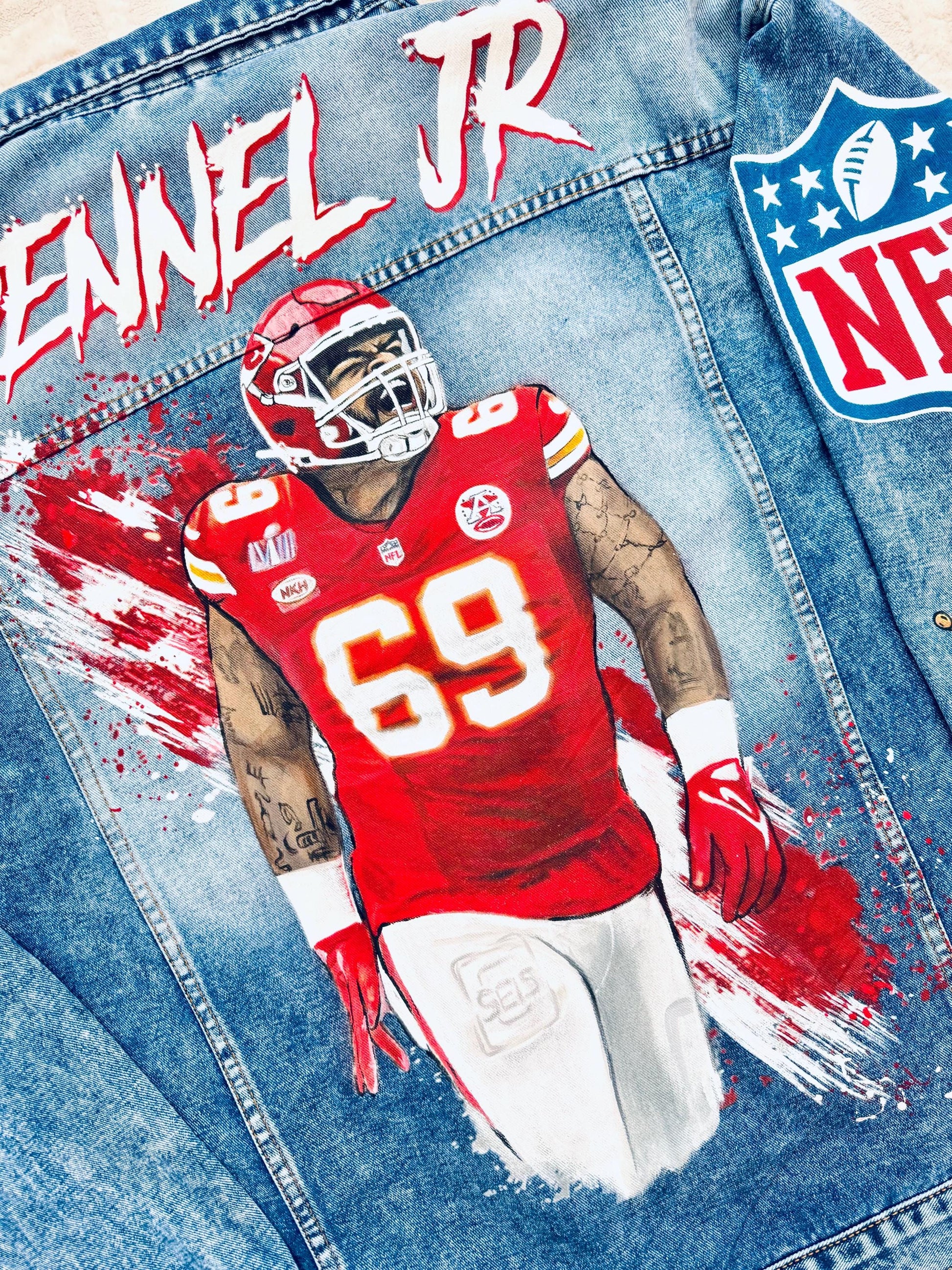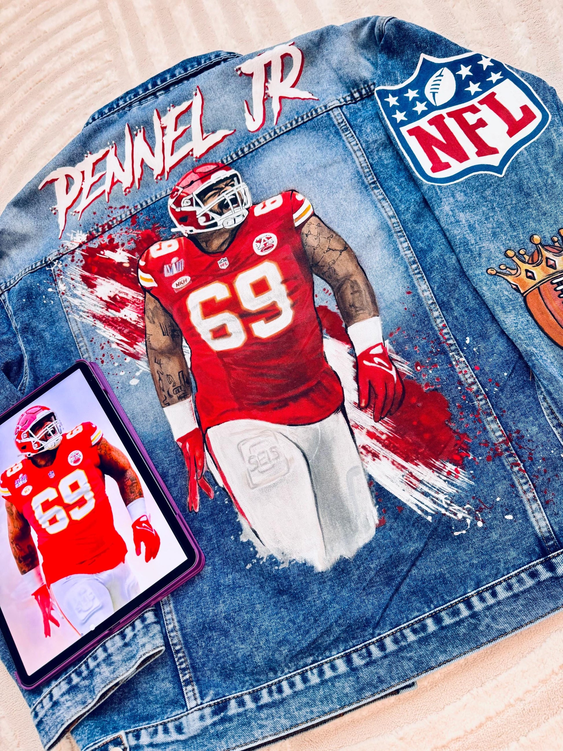 Custom Portrait Denim Jacket β Hand-Painted Artwork on Jacket, Unique Gift for Sports Fans, NFL Inspired Streetwear for Him or Her