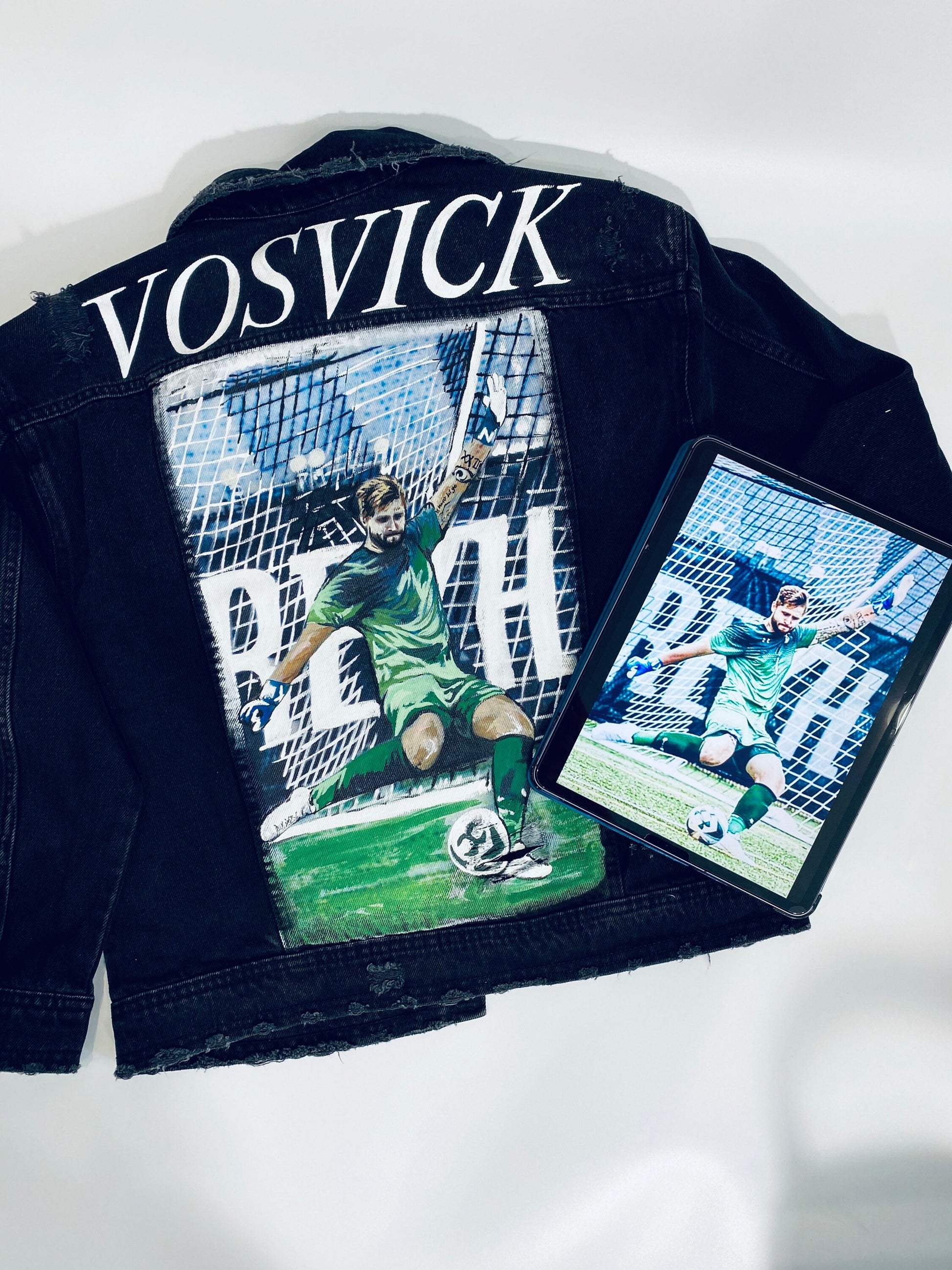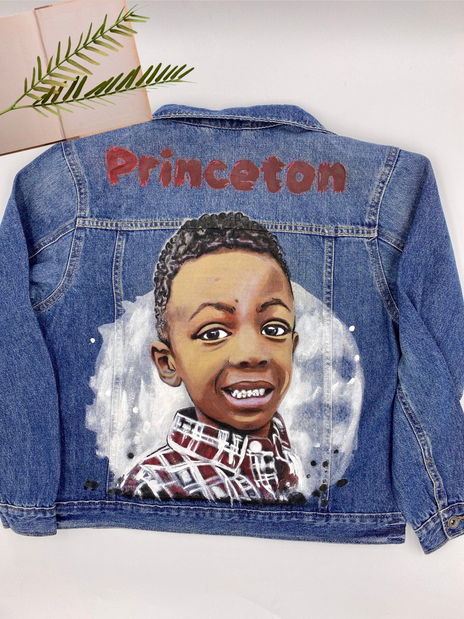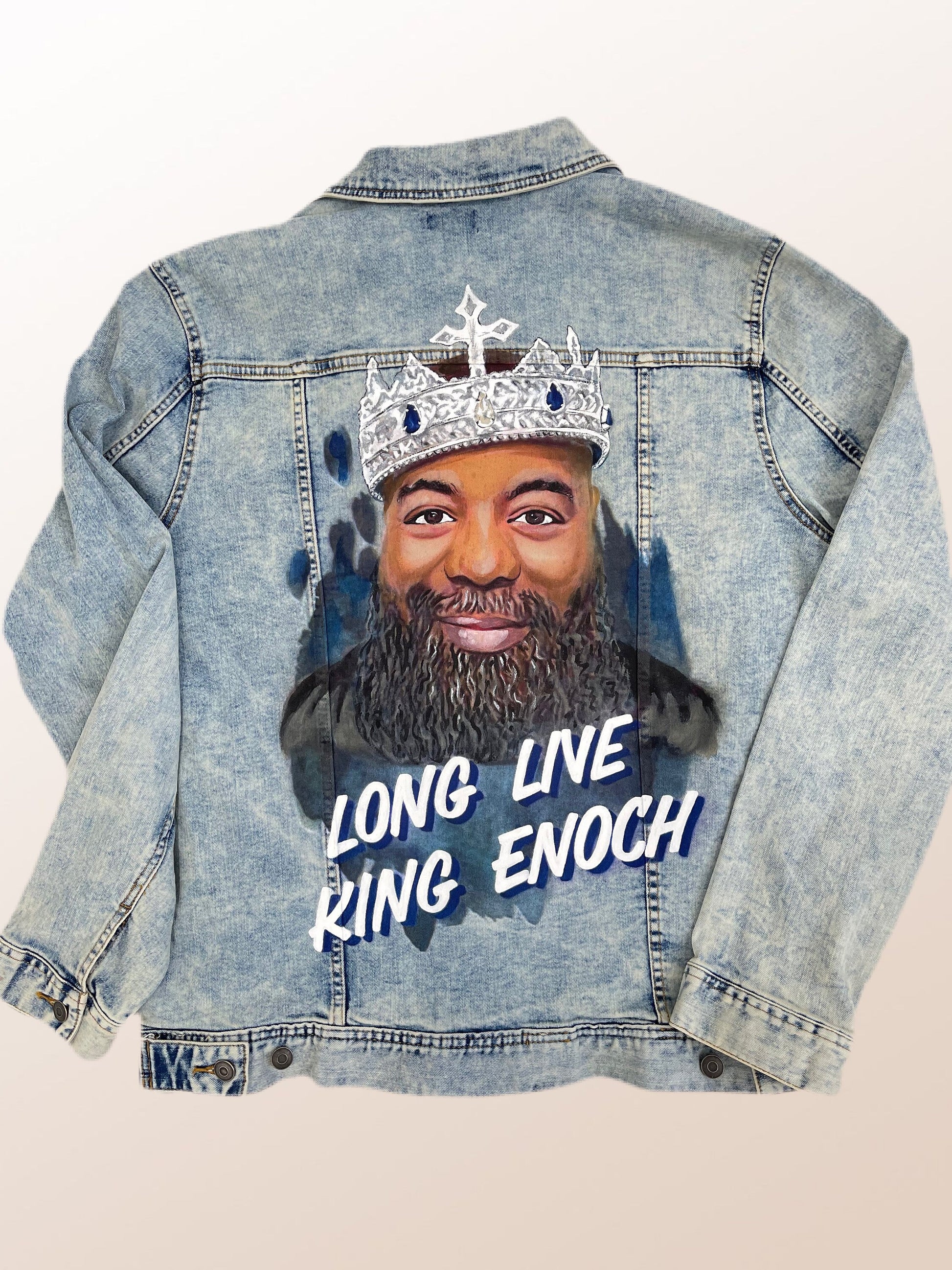 I use waterproof, environmentally friendly acrylic paint to hand paint each custom portrait. Have an item you’d like us to paint? Send it in the mail and we’ll get started right away. Alternatively we can provide a denim jacket for you at an additional cost.